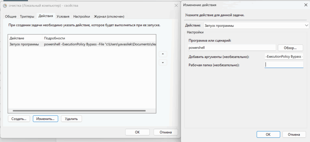 Далее в планировщике создаем задачу на запуск в нужное время программы powershell с аргументом -ExecutionPolicy Bypass -File «c:\Users\yavasilek\Documents\cleanup_downloads.ps1»